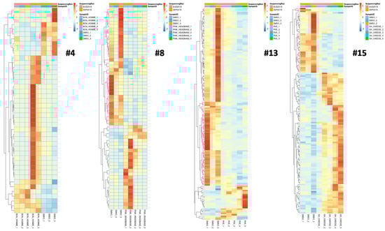 Examples of heatmaps, with the differentially expressed genes for Samples #4, #8, #13 and #15, are shown in Figure 3.