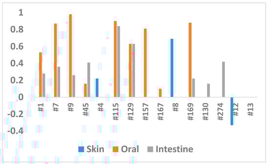 These experiments revealed that different extracts were efficient for different tissues. For example, a comparison of extracts for the reduction of inflammation in EpiOral and EpiIntestinal tissues showed that Extract #115 was equally and highly effective, while Extract #167 was not (Figure 4). At the same time, Extracts #7, #9 and #169 were effective for EpiOral tissues but not for EpiIntestinal tissues (Figure 4). Our attempts to correlate the level of cannabinoids and the efficiency of the extracts did not show any correlation. This is perhaps not surprising, as other molecules in the extracts likely have a strong modulatory effect.