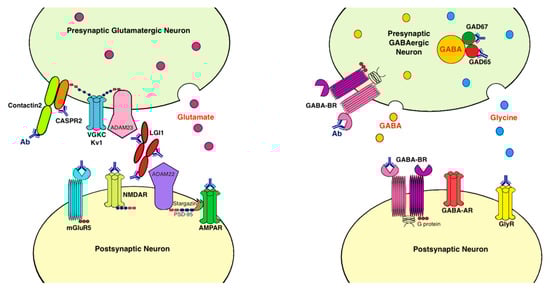 AMPARs are glutamatergic ionotropic transmembrane receptors composed of four subunits (GluA1–4) []. AMPARs are concentrated in the hippocampal CA3–CA1 region, subiculum, basal ganglia, cerebellum, and the cerebral cortex. They mediate most of the fast excitatory synaptic transmission in the brain and are critical for synaptic plasticity, learning, and memory []. LE patients’ antibodies usually target GluA1 or GluA2 subunits of AMPARs, which decrease AMPAR clustering at synapses through increased internalization of receptors but do not alter the synaptic density or cell viability [,]. In accordance with the decrease in AMPA-mediated excitatory postsynaptic currants, affected neurons also exhibit homeostatic decrease in inhibitory postsynaptic currants and reduced inhibitory synapse density, whereas the intrinsic neuronal excitability increases []. AMPAR antibodies do not cause significant neuronal apoptosis. Synaptic AMPAR cluster density was restored within a few days after removal of patients’ antibodies, and patients usually recovered to baseline after treatment [].