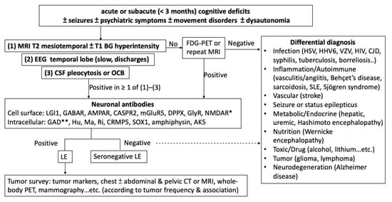 - Linnoila, J.J.; Rosenfeld, M.R.; Dalmau, J. Neuronal surface antibody-mediated autoimmune encephalitis. Semin. Neurol. 2014, 34, 458–466. [Google Scholar] [CrossRef] [PubMed]