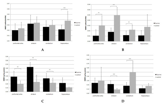 MMP2 and MMP9 mRNA (A,B) and protein (C,D) expression in analyzed brain structures (prefrontal cortex, striatum, cerebellum, hippocampus). Black bars represent means ± SD of mRNA (A,B)/protein (C,D) level in the Fluoride (F)-exposed group, while gray bars represent controls. ** p ≤ 0.005, *** p ≤ 0.001 (Mann–Whitney U test), n = 6.
