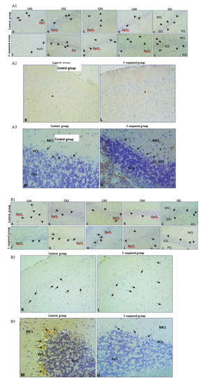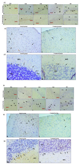 Strong expression of MMP9 was visible in the cytoplasm of Purkinje cells in the control (Figure 2, MMP9 M, black arrows), while the cytoplasm of Purkinje cells in the experimental group was characterized by markedly lower expression of MMP9 (Figure 2, MMP9 N, black arrow). The number of MMP9-immunopositive cells was significantly decreased (p = 0.002) in the fluorine group (Figure 3D).