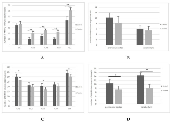 Immunohistochemical tests confirmed the findings from the quantitative analysis. All hippocampal regions of both groups showed a positive reaction confirming the presence of MMP2 and MMP9. A stronger MMP2 expression was noted in the CA2-CA4 regions of cornu ammonis (Figure 2, MMP2 G–I, black arrows) and the dentate gyrus (DG) (Figure 2, MMP2 J, black arrows) in the study group compared to the control (Figure 2, MMP2 B–E, black arrows). We also observed a statistically significant increased number of MMP2-immunopositive cells in CA2 (p = 0.002), C3 (p = 0.002), CA4 (p = 0,002) and GD (p = 0.002) regions of hippocampus (Figure 3A) in the F-treated group. No significant differences in the MMP9 expression were observed between the control (Figure 2, MMP9 A–E, black arrows) and the study group (Figure 2, MMP9 F–J, black arrows). However, a statistically significant increased number of MMP9-immunopositive cells was observed in CA1 (p = 0.026) and CA3 (p = 0.041) regions (Figure 3C) in the fluorine group.