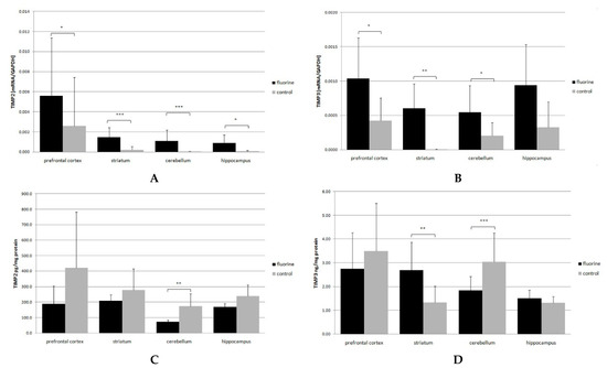 TIMP2 and TIMP3 mRNA (A,B) and protein (C,D) expression in the prefrontal cortex, striatum, cerebellum and hippocampus. Black bars represent means ± SD of protein (A,B)/mRNA (C,D) level in F-exposed group, while gray bars represent controls. * p ≤ 0.05, ** p ≤ 0.005, *** p ≤ 0.001 (Mann–Whitney U test), n = 6.