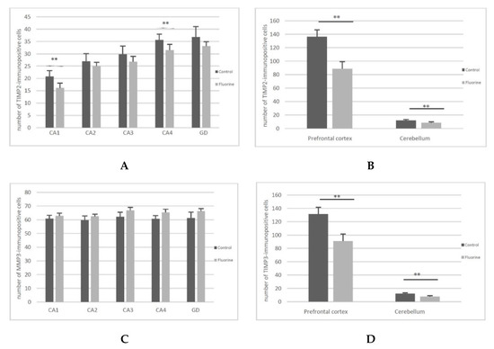 Numerous studies on humans [31,32,33,34,35,36,37] and animals [38,39,40,41,42] have shown a positive correlation of long-term exposure to elevated F levels during brain development with reduced intelligence quotient and cognitive impairment. The role played by MMPs/TIMPs in synaptic plasticity, both during prenatal development and in adulthood, is also well documented. Therefore, in this study, we examined the changes in gene and protein expression of MMP2, MMP9, TIMP2 and TIMP3 in the prefrontal cortex, hippocampus, striatum and cerebellum of rats exposed to relatively low F doses during the pre- and postnatal period.