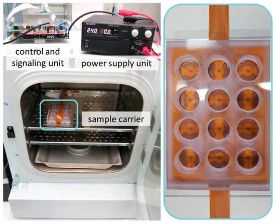 For our initial parameter study we stimulated twelve cell-seeded Col I elastin-based scaffolds independently, by using only one main supply (Figure 4). In this context, our own previous studies were disadvantaged by systems as the number of necessary function generators was limited [38,39,46]. Other partially commercially available systems would be unfavorable for our approach. On the one hand, this is due to the use of direct electrical stimulation [47,48,49,50]. On the other hand, the use of additional, external generators is necessary, which limits parallel parameter optimization [49,50,51].