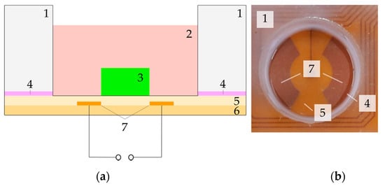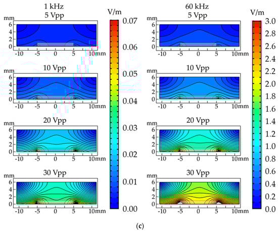 The thin polyimide insulation layer over the electrodes was defined by the ‘contact impedance’ boundary condition with a thickness of 25 µm. The electrodes were assumed as ground and terminal with time-varying input voltages. The simulations were carried out in the frequency domain as an electro-quasi-static problem. All outer boundaries of the device were modeled as electrical insulators. The used material parameters in the model are summarized in Table 2. All simulations were performed with an Intel Xeon E5-2643 (3.3 GHz, two sockets with eight cores) workstation with 128 GB RAM under Windows 10 (64-bit).