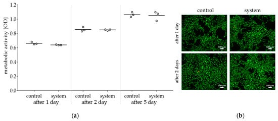 Viability of human chondrocytes following incubation for one, two or five days with conditioned medium (whole stimulation device): (a) Metabolic activity of chondrocytes treated with conditioned medium and corresponding control were determined via water-soluble tetrazolium salt (WST-1) assay. Data are illustrated as mean including mean values of measuring points (n = 3). Statistical analysis was performed with two-way ANOVA. (b) Live/dead-staining of chondrocytes after incubation with control medium or with conditioned medium; living cells (green), dead cells (red); the scale bar represents 100 µm.