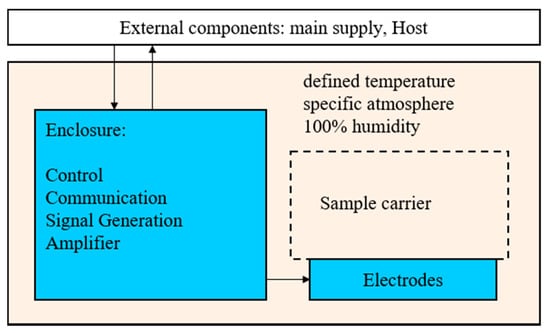 The electrical stimulation device was planned for use within an incubator to ensure stable atmospheric and temperature conditions around the specimen (Figure 4). Therefore, all electronic components had to be enclosed and sealed to avoid any unwanted interchange of the atmosphere, especially humidity. This separation was achieved by an enclosure sealed with a silicone adhesive (Troll Factory Rainer Habekost e.K., Riede, Germany). All mechanical parts were 3D printed with a material based on polylactic acid (PLA) (PLA Plus, Filamentworld, Neu-Ulm, Germany). Within the enclosure a microcontroller board (LaunchPadXL, Texas Instruments) takes place as a low-cost control and communication solution.