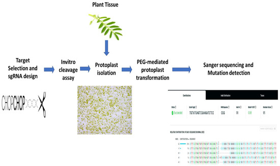 A polyethylene glycol (PEG4000)-mediated transformation was used to transform respective RNP complexes into chickpea protoplast cells. The PEG transformation protocol for the efficient targeted knockout in both genes was adapted from previous studies [6,10,49,67]. The 2 × 105 resuspended protoplasts were transformed with Cas9 protein and sgRNA in a ratio of 1:1. Protoplasts (200 μL, 2 × 10 cells) and RNPs for example, 1:1 is Cas9 30 μg (stock 10 μg/μL) and sgRNA 30 μg (stock 10 μg/μL) used for transformation. Before the transformation experiment, Cas9 and sgRNA were pre-mixed to form the RNP complex and incubated at room temperature for 10 min. Further, all the components, protoplast, Cas9, and sgRNA mix were combined, and an equal volume of freshly prepared PEG 4000 added (40% PEG [w/v] PEG 4000, 0.2 M mannitol, 0.1 M CaCl2), with immediate mixing to prevent aggregation. This mixture was incubated at room temperature for 20 min. An aliquot (400 µL) of W5 solution (2 mM MES pH 5.7, 154 mM NaCl, 125 mM CaCl2 and 5 mM KCl) was added, mixed, and incubated at room temperature for 10 min. An additional 800 μL of filter sterilized W5 solution was added to the tubes, mixed gradually, and incubated at room temperature for 10 min. The tubes were centrifuged at 50× g for 5 min; the supernatant was discarded, and another 1 mL of W5 solution was added to the tubes. Subsequently, the tubes were incubated overnight at room temperature in the dark. The lower sediments were collected for genomic DNA isolation from the protoplast cells. Three biological replicates of the protoplast transformation were performed for each set of genes. Genomic DNA was isolated from protoplast cells for Sanger sequencing. The sample treated only with the Cas9 enzyme was used as a negative control. The transformation experiments were repeated twice, and similar results were obtained both times.