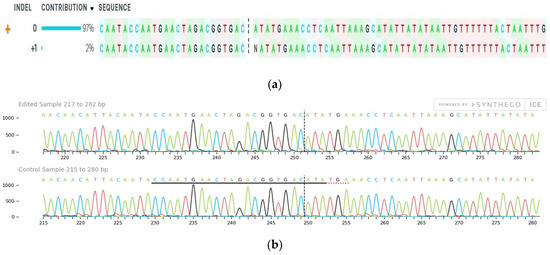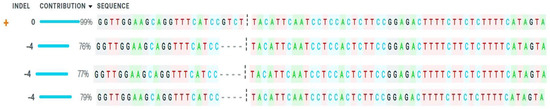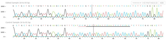 Sanger sequencing was performed to detect mutations in the transfected protoplasts. The DNA was isolated from the transformed protoplast, and target regions were amplified using primer sets to conduct sequencing. The PCR program for sequencing samples is also provided in Table S2 and the PCR reaction to amplify the sequencing fragment is provided in Table S4. The results obtained from Sanger sequencing are classically given as nucleotide occurrence chromatograms for respective samples, represented as distinct colored peaks. Usually, the biggest drawback in protoplast mutation identification is that mutated protoplast DNA chromatograms do not provide any apparent indication of the mutation due to the difference in editing forms in each protoplast cells and the presence of unmutated protoplast cell DNA in each sample. To overcome these challenges, Inference of CRISPR Edits (ICE), a bioinformatics tool by Synthego, was used for mutation detection [45] The RVE7 sgRNA 1 results showed 76%, 77%, and 79% indel percentage for the treated protoplast samples compared to the 99% for control sample, with average of 77.3% and standard deviation of 0.81 for all treated samples (Figure 5 and Figure 6). Indel percentage is the editing efficiency (percentage of the pool with non-wild type sequence) as determined by comparing the edited trace to the control trace. The knockout score represents the proportion of cells that have either a frameshift or 21+ bp indel. The knockout score is used in an understanding of the number of the contributing indels expected to result in a functional knockout of the target gene.