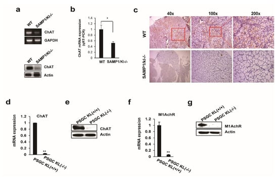 2.3. Choline Acetyltransferase (ChAT) is Downregulated in Primary Salivary Gland (PSGC) kl -/- Cells and SAMP1/kl -/- Mice