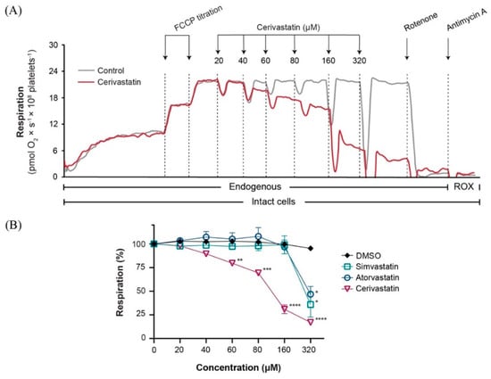 Statins induced a concentration−dependent inhibition of mitochondrial respiration in intact human platelets. (A) Representative traces of cerivastatin (red) and DMSO (grey) titration. Respiration of human platelets was measured after sub-maximal uncoupling with FCCP (2 µM). (B) The concentration-dependent effect of simvastatin (open square), atorvastatin (open circle) and cerivastatin (open triangle) was measured by titrating increasing concentrations of statin or vehicle (DMSO) (black rhombus). Data is expressed as mean±SEM. FCCP, carbonyl cyanide p-(trifluoromethoxy) phenylhydrazone; DMSO, dimethyl sulfoxide; ROX, residual oxygen consumption. Two-way ANOVA with Bonferroni post hoc test was performed on antimycin-corrected data. * p < 0.05; ** p < 0.01; *** p < 0.001; **** p < 0.0001 vs. DMSO.