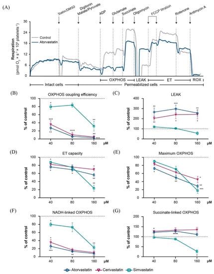 In order to further dissect the mechanisms of statin-related ETS impairment, the concentration-dependent effect of three concentrations (40, 80 and 160 µM) of each statin on mitochondrial respiration was evaluated in permeabilized platelets.