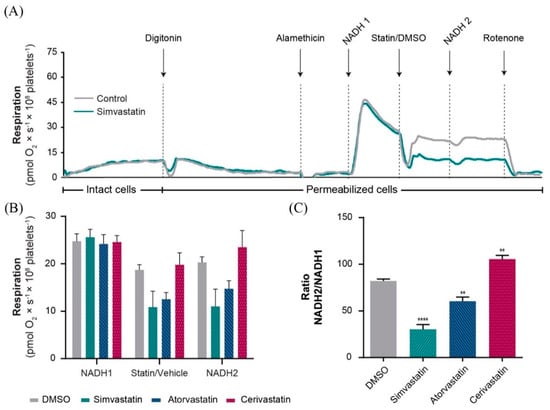 Protocol III—Permeabilized mitochondria. Evaluation of the effect of statins on NADH-induced oxygen consumption. In order to ascertain whether the statins directly or indirectly inhibit complex I (NADH-dehydrogenase), platelet mitochondria were exposed to NADH before and after the addition of the highest concentration of statin that had been shown to decrease mitochondrial respiration in previous experiments. Specifically, permeabilized platelets with permeabilized mitochondria (digitonin, 1 µg/1 × 106 platelets and alamethicin, 5 µg/mL, respectively) were exposed to the specific complex I substrate NADH (0.75 mM), followed by a single addition of statin (160 µM) vs. DMSO. Residual NADH-linked respiration was evaluated by a second addition of NADH with the same concentration in order to measure the difference in response of the mitochondrial respiration before and after statin exposure. Complex I was then inhibited using rotenone (2 µM).