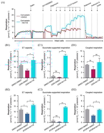 Since we had demonstrated that cerivastatin and atorvastatin caused mitochondrial dysfunction via the inhibition of NADH-linked respiration (Figure 2A) we further investigated whether the respiratory impairment caused by a concentration of 80 µM of these statins can be alleviated in the presence of the cell-permeable succinate prodrug NV118. A representative overlay trace of statin-exposed platelets in the presence or absence of NV118 is depicted in Figure 4A. The addition of the prodrug to either atorvastatin or cerivastatin-exposed platelets resulted in an increase in the ET capacity of the treated platelets (Figure 4B1,B2) by increasing succinate-supported mitochondrial oxygen consumption (Figure 4C1,C2) leading to levels of coupled respiration similar to those of the control samples (Figure 4D1,D2).