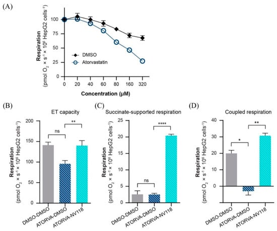 The effects of NV118 on statin−dependent respiratory dysfunction in HepG2 cells. (A) Respiration was assessed after sub-maximal uncoupling with FCCP (4 µM) followed by increasing concentrations of atorvastatin or vehicle (DMSO). NV118 effects on atorvastatin exposed HepG2 cells (B–D) were measured as compared to its vehicle (DMSO). As negative control of the experiment HepG2 cells were exposed only to DMSO (DMSO-DMSO). Data is expressed as mean ± SEM. One-way ANOVA with Bonferroni post hoc test was performed on antimycin-corrected data. ATORVA, atorvastatin; DMSO, dimethyl sulfoxide; ET, electron transport. ns = no significance; * p < 0.05; ** p < 0.01; **** p < 0.0001.
