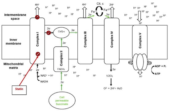 Mitochondrial dysfunction has been systematically reported to play an important role in the pathophysiology of SAMS [7,8,9]. Thus, statins interfere with mitochondrial function in a concentration-dependent manner in various cell lines, animal and human tissue samples either due to the HMG-CoA inhibition or off-target effects. With respect to the latter, varied and complex interference with the activity of the electron transport system (ETS) and mitochondrial content have been reported in skeletal muscle [9,10,11,12,13].