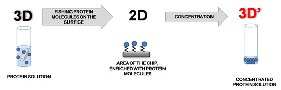 The usage of functionalized surfaces (2D) permits one to efficiently concentrate protein molecules on a small area of a chip from a solution (3D) in an amount sufficient for the subsequent mass spectrometric analysis (3D’) [4,5,7] (Figure 1).