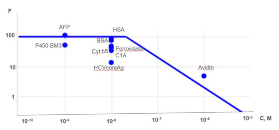 Dependence of F on the concentration (in logarithmic scales) of protein in solution. Experimental conditions: the functionalized surface area of the chip is 1 mm2, the volume of the initial solution (3D) of the analyte is 1 mL, the volume of the final solution (3D’) of the analyte is 10 μL. The protein concentration on the chip surface was conducted as a chemical fishing, and measurements of the signal were performed on an Autoflex III mass spectrometer (time of flight—TOF). The description of proteins is presented in Table 1.