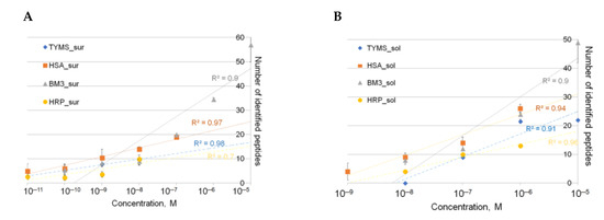 Dependence of the number of detected protein peptides on the protein concentration in solution (A) and proteins immobilized on the surface with a molecular relief (B). Measurements were taken using matrix-assisted laser desorption and ionization-mass spectrometry (MALDI-TOF-MS) on an Autoflex III instrument (TOF). Measurement conditions: 2000 laser shocks, laser intensity, and frequency 90% and 60 Hz, respectively.