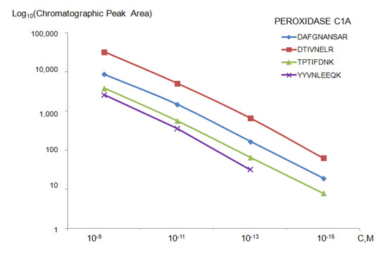 The dependence of the chromatographic peak areas plotted for four peptides on the concentration of horseradish peroxidase (Peroxidase C1A) in the incubation solution in a range of 10−9–10−15 M. Measurements were performed on a QqQ, Agilent 6495 LC/MS triple quadrupole mass spectrometer.