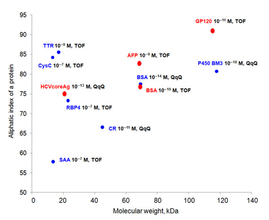As demonstrated (Figure 7, red dots), the best concentration sensitivity at the level for proteins concentrated on the surface of the AFM chip using affinity methods was achieved for objects characterized by different molecular weights from 20 to 120 kDa and an aliphatic index value from 75 to 91—glycoprotein HIV-1 gp120 (LOD 10−11 M and TOF), human serum albumin (HSA, LOD 10−9 M, IT, and TOF), bovine serum albumin (BSA, LOD 10−10 M, and TOF), core antigen of viral hepatitis C (HCVcoreAg, LOD 10−13 M, and TOF), horseradish peroxidase (HRP, LOD 10−15 M, and QqQ). In the literature (blue dots in the figure), using immunoaffinity fishing and monoclonal/polyclonal antibodies (magnetic microsized spheres, nozzles for automatic pipetting), most of the blood plasma proteins were recorded at concentrations of 10−7–10−9 M for TOF and 10−11–10−18 M for QqQ, including transthyretin (TTR, LOD 10−9 M, and TOF), cytochrome P450 BM3 (P450 BM3, LOD 10−18 M, and QqQ) [12], bovine serum albumin (BSA, LOD 10−14 M, and QqQ) [12], serum amyloid A (SAA, LOD 10−7 M, and TOF) [13], cystatin C (CysC, LOD 10−9 M, and TOF) [14], calreticulin (CR, LOD 10−11 M, and QqQ) [15]. The physicochemical properties of proteins presented in the literature are also different. Thus, the molecular weight of the described proteins ranges from 17 to 120 kDa and the aliphatic index values are from 58 to 85.