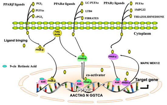The activation of PPARs requires heterodimerization with the nuclear receptor, RXR. PPARs/RXRs can be activated by 9-cis retinoic acid or natural or synthetic PPAR ligands [15]. The PPAR–RXR complex recruits other cofactors before binding to the PPAR responsive element (PPRE) at the promoter regions of PPAR-responsive genes, usually 5′-AACT AGGNCA A AGGTCA-3′ [16], thus activating or repressing their activities [17].