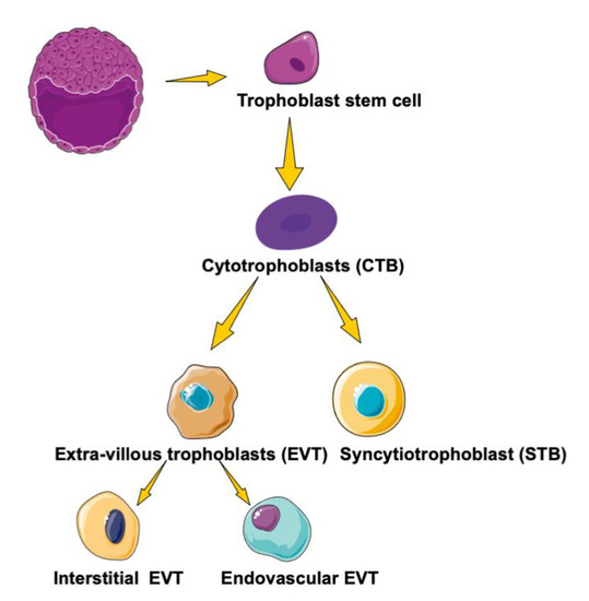 Trophoblast comes from the Greek word “tropho” that refers to feeding the epithelial cell in the placenta. This transient organ plays a pivotal role in fetal growth and development during pregnancy [29]. For a human, the trophectoderm (TE) expands during the early post-implantation period to form a shell around the embryo, thus being composed mostly of self-proliferative cytotrophoblast (CTB). CTB cells act as stem cells with the ability of continuous proliferation and cell differentiation [30]. CTB cells subsequently differentiate into two main subtypes: in the villous pathway, CTBs fuse into syncytiotrophoblast (STB), thereby forming the main site for serving as the gas and nutrient exchange fetal–maternal interface, while others undergo the epithelial-to-mesenchymal transition to differentiate into invasive extravillous trophoblast (EVT) [30,31]. EVT can be further divided into two subtypes: one subtype invades deeply into the uterine wall as groups of cells, termed interstitial EVT, and the other invades the maternal decidual arterioles as endovascular EVT [32] (Figure 2). Trophoblast differentiation is a multifactorial and dynamic process that bridges the exchange between mother and fetus as well as the endocrine functions of the placenta. Three isotypes of PPARs and RXRs are mainly in STB and CTB in the first trimester of the placenta, suggesting that PPARs play specific roles in trophoblast differentiation and functions of the placenta. Data concerning PPARs and RXRs expression are summarized and referenced in Table 2.