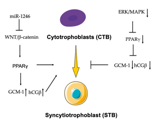 PPARγ involved in trophoblast differentiation. The activation of PPARγ increased the expression of chorionic gonadotropin beta-subunit (hCGβ) and chorion-specific transcription factor (GCM-1), which promoted cytotrophoblast (CTB) differentiation into the STB. miR-1246 promoted STB differentiation through inhibiting the WNT/β-catenin signaling pathway and increasing the expression of the crucial transcription factor PPARγ. The loss of the ERK/MAPK cascade caused the reduced expression of PPARγ, affected the expression of GCM1, and inhibited the process of CTB differentiation into the STB.