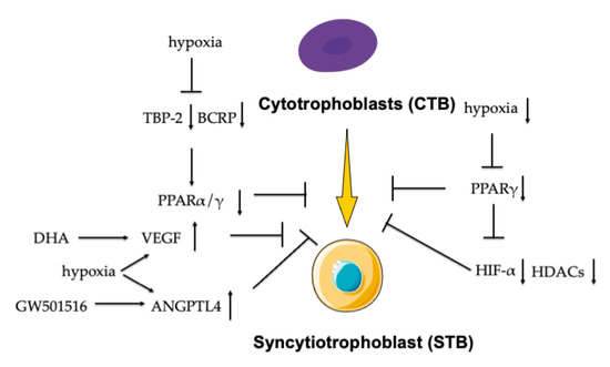 There is also the link among hypoxia, PPARs, and trophoblast differentiation. Daoud et al. proposed that cobalt, a mimic hypoxia chemical agent, inhibited the heart and liver fatty acid-binding protein (H-, L-FABP) and PPAR expression and impaired trophoblast cell differentiation by inducing Hash-2 expression [51]. Hypoxia downregulated the expression of PPARγ in trophoblast, thus decreasing labyrinthine differentiation to trophoblast stem cells by the mechanism independence of both hypoxia-inducible factor (HIF) and histone deacetylases (HDACs) [52]. HIF is known for regulating trophoblast differentiation [53,54,55]. Iodine stimulated the HIF-1α signal to induce oxidative stress with the activation of transcription factor PPARγ, thus leading to abnormal differentiation and migration of trophoblast [56]. Liao et al. put forward that PPARγ and HIF-α are involved in oxidative stress and metabolic stress that are caused by TCDD-induced trophoblast toxicity and the impairment of the placenta vascular network [57]. Hypoxia decreased the expression of TATA-binding protein (TBP-2) and breast cancer resistance protein (BCRP) that are induced by suppressing PPARα and γ, then hampered trophoblast differentiation [58,59]. One of the PPAR ligands, DHA, can stimulate the expression of angiogenesis growth factors, including vascular endothelial growth factor (VEGF), and the PPARβ ligand (GW501516) stimulates another angiogenesis ANGPTL4 expression in first-trimester trophoblast cells, implying that DHA mediates the tube formation process by regulating the secretion of VEGF in first-trimester trophoblast cells [60]. As VEGF and ANGPTL4 expression are increased by hypoxia in the regulation of tight junction structure and function in trophoblast cells [61], the findings correlate PPARs and hypoxia with abnormal trophoblast differentiation and placental insufficiency syndromes of preeclampsia (PE) and intrauterine growth restriction (IUGR) [62,63] (Figure 4).