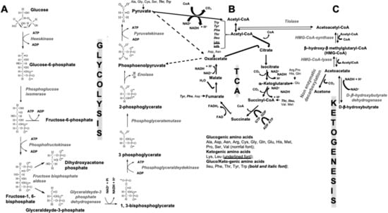 Scheme of interconnections between glycolysis (A), tricarboxylic acids cycle (TCA) (B), and ketogenesis (C). ADP = adenosine diphosphate; ATP = adenosine triphosphate; Acetyl-CoA = acetyl coenzyme A; CO2 = carbon dioxide; CoA = coenzyme A; FAD = flavin adenine dinucleotide; GDP = Guanosine diphosphate; GTP = Guanosine triphosphate; H+ = positively charged hydrogen ion, i.e., a hydrogen atom deprived of its electron; HMG-CoA = 3-hydroxy-3-methyl-glutaryl-coenzyme A; NAD = nicotinamide adenine dinucleotide; NADH = reduced version of NAD; Pi = inorganic phosphate; at the bottom of Figure 1B (under the TCA) classification of glucogenic-, ketogenic-, and gluco/ketogenic amino acids is reported together with the specification of the font type in which they are written.