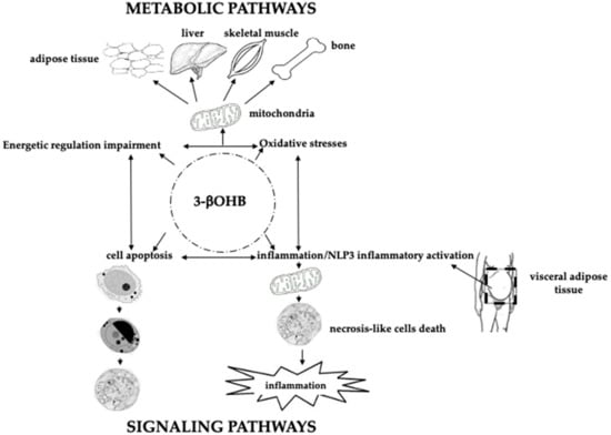 Schematic role of 3betahydroxybutyrate (3βOHB) in energy metabolism, response to oxidative stress, apoptosis, inflammation and signaling pathways. In the center of the figure, within the dotted circle, is depicted the molecule of 3βOHB, “central” to all the physiological events described. The top of the figure shows how 3βOHB, “through the intervention of mitochondria”, may impact the metabolism of adipose tissue, liver, skeletal muscle, and bone, both in terms of oxidative stress modulation and energetic regulation impairment. In turn, oxidative stress, and energetic regulation impairment impact, even with 3βOHB, on cell apoptosis, and inflammation/NLP3 inflammatory activation, (lower figure). Visceral adipose tissue plays an active role on the above events. Thus, 3βOHB may act as a signaling molecule.