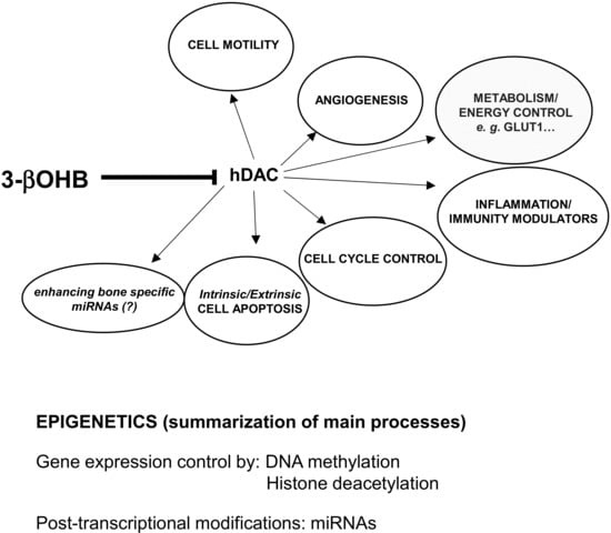 Molecular links between biological functions, environmental factors and 3betahydroxybutyrate (3βOHB). 3βOHD inhibits the function of histone deacetylases (hDAC), molecules representing key transcriptional cofactors that regulating gene expression by deacetylation of lysine residues on histone and nonhistone proteins. Activity of hDAC is important to regulate/influence all the physiopathological events inserted inside the ellipsoidal figures. Through the influence exerted on the processes of DNA methylation, histonic deacetylation and microRNAs expression, 3βOHB may act at epigenetic levels, mostly involving changes that affect gene activity and expression.