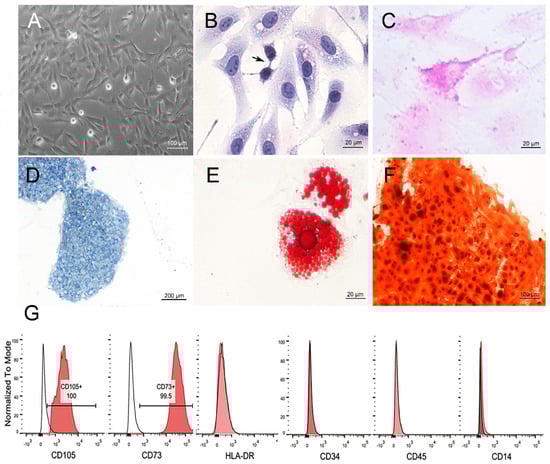 Figure 1. Urine stem cells (USCs) characterization; (A) Phase–contrast light micrograph (LM) at passage zero showing stellate shaped cells with membrane projection reaching nearby cells (original magnification ×100, scale bar = 100 µm). (B) hematoxylin and eosin staining of USCs at passage three, showing basophilic stellate cells with perinuclear eosinophilia, large central nuclei, and cytoplasmic projections Actively dividing cells were occasionally seen represented by kissing cells (arrow) (original magnification ×400, scale bar = 20 µm). (C) Periodic acid–Schiff (PAS) staining of USCs at passage three, showing perinuclear magenta color (original magnification ×400, scale bar = 20 µm). (D) Toluidine Blue staining of USC pellet following chondrogenic differentiation showing blue staining proteoglycan–rich extracellular matrix (original magnification ×40, scale bar = 200 µm). (E) Oil Red O staining of the induced adipogenic cells showing red staining of intracellular lipid (original magnification ×400, scale bar = 20 µm). (F) Alizarin Red staining of induced osteogenic cells showing a dark orange discoloration of the calcification nodules (original magnification ×100, scale bar = 100 µm). (G) A representative sample of immune phenotypical characterization of 105 USCs (shaded curve) showing positive expression of CD105, CD73, and negative for HLA–DR, CD34, CD45, and CD14.