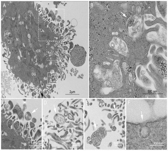 Figure 2. Transmission electron microscopy (TEM) characterization of USCs, and extracellular vesicles EVs morphology and Biogenesis; (A) USCs TEM where different cell structures can be visualized such as the nucleus (N), abundant mitochondria (M), rough endoplasmic reticulum (rER), lysosomes (ly), pools of dense granules (DG) and multivesicular body (MVB); magnified in (B), where biogenesis of exosomes can be observed in the three phases described, endosomes (Endo), MVB containing intraluminal vesicles of different sizes (Asterix) and fusing of MVB to the membrane with exosome release (Mic. Mag. ×13,000). The cell membrane exhibits multiple projections, membrane budding forming vesicles (solid square) and micro–vesicles (large dotted square, illustrated in (C) containing dense granules varying in size, shape, and content, (Mic. Mag. ×2900). (CE) The pictures show the heterogenicity in sizes and density, varying dense granules containing larger vesicles between 150 nm–1µm, typical for micro–vesicles (CE), and homogenous less granular vesicles < 150 nm, typical for exosomes (E,F), (Mic. Mag. ×2900). (F) Vesicle enclosed by USC membrane, mimic endocytosis (Mic. Mag. ×18,500) (Lead citrate/Uranyl acetate stain).