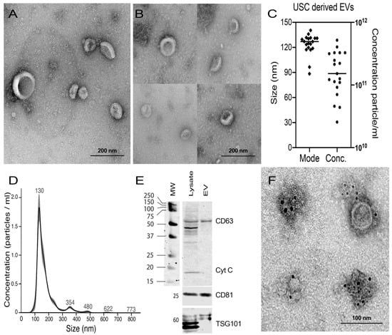 Figure 3. Characterization of USCs–derived EVs; (A,B) TEM negative staining of the isolated EVs showing cup–shaped vesicles with an average size of 110 nm visualized at lower magnification (A; Mic. Mag. ×23,000) and higher magnification (B; Mic. Mag. ×30,000) (2%Uranyl Acetate). (C) Histogram presentation of 19 EVs pellets collected from 1.6 × 107 USCs analyzed for size and concentration, showing an average size of 122 nm and an average concentration of 1.90925 × 1011. (D) Size distribution curve of USCs isolated EVs particle concentration (×107) vs. particle size mode, measured by nanoparticle tracking analysis (NTA) showing the average of the six technical replicate measurements for each exosome isolation by NanosightS300. (E) Western blot of USCs cell lysate and isolated the EVs for CD63, CD81, TSG101 antibodies as positive markers for EVs and Cytochrome C as mitochondrial membrane marker (cellular Marker) and negative marker for EVs. (F) Immune gold staining of the isolated vesicles for CD63 using 6 nm gold nanoparticles (2% Uranyl Acetate, scale bar = 100nm, Mic. Mag. ×30,000 (upper left) and ×23,000 rest).