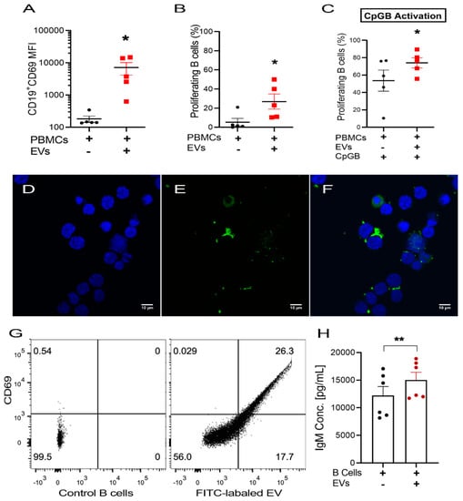 Figure 4. The effect of USCs EVs on B cells; (A) CD69 (early activation marker) expression on B cells population showing increased expression with EV co-culture. (B,C) Proliferation assay of the % proliferating B cells as the result of EVs co-culture in (B) resting and (C) CpGB–stimulated conditions showing significant enhancement of proliferation in both conditions in response to EV co-culture (n = 5). (DF) Confocal microscopy images of DAPI (4′,6-diamidino-2-phenylindole) stained purified B cells (D) co-cultured with labeled EVs (E) for 24 h, (F) showing the presence of labeled EVs inside the cytoplasm and in aggregates attached to the cell surface (Mic. Magnification ×600, scale bar = 10 µm). (G) A representative sample of flow cytometry analysis of CD69+ B cell population for FITC labeled EVs uptake versus control. (H) Antibody analysis of the supernatant showing a significant increase of IgM with EV co-culture (n = 6). Values are presented as Mean ± SEM, p-values were determined by Paired Student’s t–tests. * p < 0.05, ** p < 0.01.