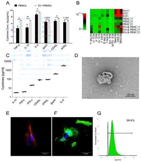 Figure 5. Cytokines Analysis of the EVs; (A) Cytokines analysis of EV co-culture supernatant run by Biolegend plex assay shows a significant increase in IL6, CD40L, IL10, and TNFα in response to EV co-culture (n = 3). (B) Heat map of the EV lysates, PBMCs, and the co-culture for cytokines concentration generated by Bio–legendplex software. (C) Cytokines analysis of 10 µg/mL EV lysates shows the expression of considerable amounts of IL–6, BAFF, APRIL, CD40L, and traces of IL–10, TNFα, and IFN–γ (n = 3). (D) Immune gold staining of the isolated vesicles for CD40L using 6 nm gold nanoparticles (Mic. Mag. ×23,000, 2% Uranyl Acetate). (E) Confocal microscope image of DAPI (blue) stained USC after permeabilization for CD40L mAb (red) (Mic. Mag. ×600, scale bar = 20 µm). (F) Confocal microscope image of DAPI (blue) stained USCs after staining with BAFFR mAb (green) (Mic. Mag. ×600, scale bar = 50 µm). (G) Flow cytometry analysis of 104 USCs for BAFFR expression showing 99% positive cells (green shaded histogram) in relation to the isotype control (non–shaded histogram), representative sample. Values are presented as mean ± SEM and p–values were determined by paired Student’s t–tests. Cytokines data are prior to log treatment. * p < 0.05, ** p < 0.01.