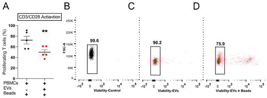 Figure 6. USCs EVs effect on T cells in response to anti–CD3/CD28 stimulation; (A) Effect of the EVs on the proliferation of T cells in the presence of anti–CD3/CD28–bead stimulation showing significant suppression of the T cell proliferation (represented by % proliferating cells, n = 5). Values are presented as mean ± SEM, and p-values were determined by paired t–test analysis. ** p < 0.01. (BD) A representative sample of the viability assay of CD3+ (T cell) population where (B) control T cells viability, (C) viability in response to EVs co-culture. (D) Viability in response to EV co-culture in the presence of anti–CD3/CD28 beads. Note the decrease in the viable population in the activated T cells co-cultured with EVs.