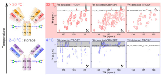 As mentioned above, 1H-detected multidimensional NMR experiments allow site-specific observation of mAbs at high temperature. Measuring at higher temperature, however, possibly induces the deterioration and aggregation of the biologics, due to structural and chemical heterogeneity of mAbs that might not exist at lower temperatures. In addition, the aforementioned experiments yield almost no signal at 4 °C [67] (Figure 2; bottom). This is simply because a slower tumbling of mAbs at lower temperatures enhances the transverse relaxation of NMR coherences. At typical storage temperature (4 °C), the rotational correlation time (τc) of proteins is estimated to be two-fold greater at than at 32 °C. This means that a mAb behaves like a 300 kDa protein at 4 °C. Therefore, a strategy to measure the mAb NMR signals at a wider range of temperatures, including low storage temperature, and under various formulation conditions is required.