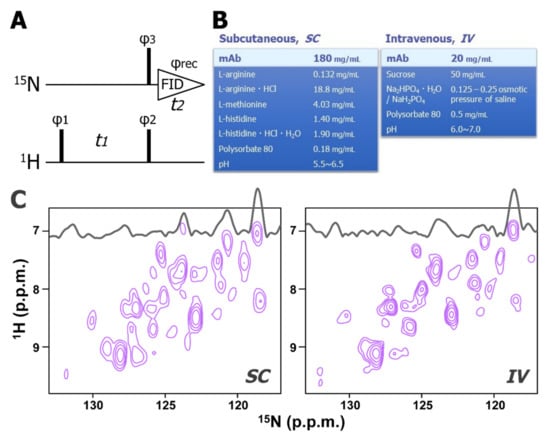 Two-dimensional 15N-detected CRINEPT spectra of mAb in formulated storage condition. (A) The pulse sequence of the 15N-detected CRINEPT experiment. Narrow bars indicate π/2 hard pulses. The phase cycles employed were φ1 = (x−x), φ2 = y, φ3 = (x−x−x−x), and φrec = (x−x−x−x). Phase-sensitive acquisition in the indirect 1H dimension is achieved by incrementing the phase φ1 in a STATES-TPPI manner [71]. (B) Examples of formulation condition for subcutaneous injection (SC; left), and intravenous injection (IV; right) (C) The 15N-detected CRINEPT spectra of the mAb in the SC (left) and IV (right) formulations. These spectra were acquired at 4 °C. The figure is reproduced from [67].
