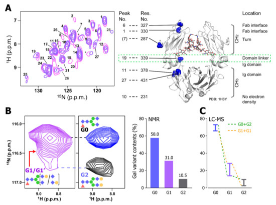 The HOS analysis of a mAb using a 15N-detected CRINEPT experiment. (A) Overlaid 15N-detected CRINEPT spectra of [15N-Ala] mAb in SC (pink) and IV (blue) formulations. The assignments are based on the chemical shifts of the Ala resonances of the Fc fragment. as previously reported [51]. The structure of the Fc fragment (1H3Y) [72] is shown along with the positions of Ala residues. Signals from 15N TROSY components are labeled with numbers. (B) The heterogeneity of the galactosylation states analyzed by the 15N-detected CRINEPT experiment. Left: the 1H–15N resonance of Lys-248 in the 15N-detected CRINEPT spectrum of the intact mAb is shown along with those from the ΔGal (blue) and Gal (black) samples, which are enzymatically galactosidated and galactosylated, respectively. Right: ratios of different galactosylation states, estimated from the deconvolution of the Lys-248 resonance in the intact mAb. (C) Ratios of different galactosylation states by LC–MS analysis. Reflecting that the analysis cannot discriminate G0_G2 and G1_G1 states, each bar represents the upper and lower limits of the indicated population. The figure is reproduced from [67].