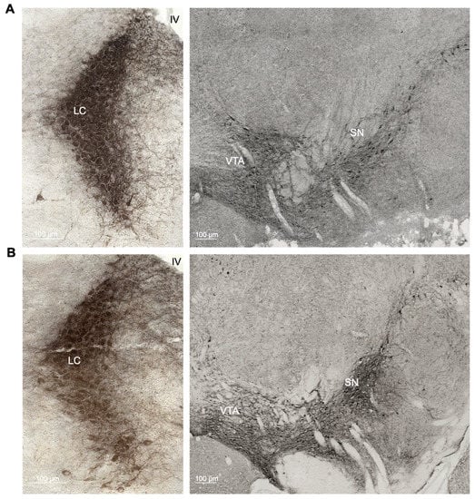 - Gaspar, P.; Berger, B.; Febvret, A.; Vigny, A.; Henry, J.P. Catecholamine innervation of the human cerebral cortex as revealed by comparative immunohistochemistry of tyrosine hydroxylase and dopamine-beta-hydroxylase. J. Comp. Neurol. 1989, 279, 249–271. [Google Scholar] [CrossRef] [PubMed]