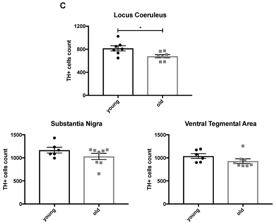 (A,B) Representative photomicrographs of the tyrosine hydroxylase (TH)-positive regions locus coeruleus (LC), substantia nigra (SN) and ventral tegmental area (VTA) in young and old animals. (C) Quantitative stereological analysis of the total number of TH-positive cells of young (3-month-old) and old (22-month-old) C57BL/6J wild-type mice.* p < 0.05 according to Student’s t-test (n = 6–8 per age group). Dots represent single animals, columns represent mean values, and error bars represent standard error of means (SEM).