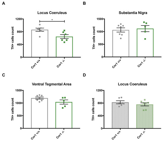 Subsequently, we compared the number of TH-positive cells in the LC, SN and VTA between 18-month-old wild-type and Cnr1−/− mice. In the LC, the number of TH-positive cells was significantly lower in Cnr1−/− mice than in age-matched wild-type littermates (t10 = 2.663; p = 0.0238) (Figure 2A). In contrast, we found no genotype effects for the VTA (t10 = 1.806; p = 0.1010) or the SN (t10 = 0.385; p = 0.7084) (Figure 2B,C). To test whether Cnr1−/− mice generally have a reduced number of LC neurons independently from their age, we also analyzed the number of TH-positive cells in the LC in 3-month old wild-type and Cnr1−/− mice (Figure 2D). We found no difference between the genotypes (t11 = 0.971; p = 0.352), thus strongly indicating that the difference observed in old mice is due to an exacerbated age-related loss of TH-positive LC neurons in Cnr1−/− mice.