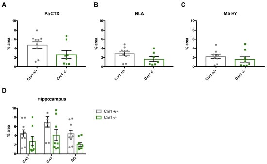 Our data show that the area covered by NET-positive signal was significantly lower in 18-month-old Cnr1−/− mice (genotype effect: F(1,15) = 8.104; p = 0.0122) in all the target regions (region x genotype interaction F(5,750) = 0.6898; p = 0.6327) (Figure 4).