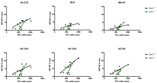 Correlation analysis between the number of tyrosine hydroxylase (TH)-positive cells and the NET-positive axon densities in the parietal cortex (Pa CTX), basolateral amygdala (BLA), mediobasal hypothalamus (Mb HY) and hippocampal cornu ammonis 1 (HC CA1), cornu ammonis 3 (HC CA3), and dentate gyrus (HC DG) in wild-type and Cnr1−/− mice.