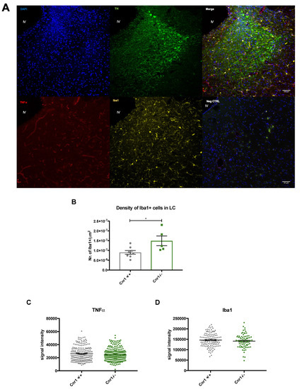 Iba1 and TNFα signal intensities were analyzed within the Iba1-positive microglia within the LC in both hemispheres using Fiji software. GFAP staining was analyzed as the percentage of GFAP-covered area in the LC.