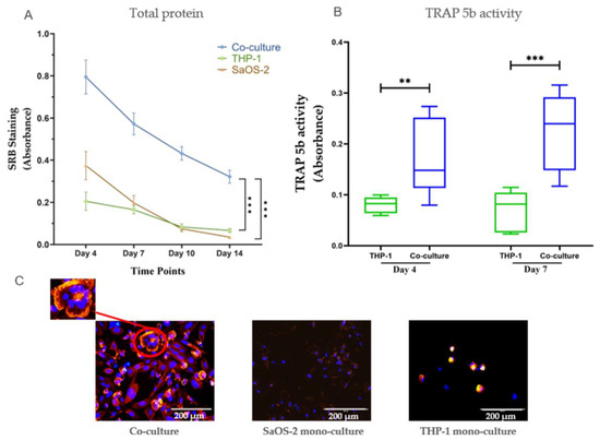 Comparison of SaOS-2 and THP-1 mono-culture and co-culture. (A) Sulforhodamine B (SRB) staining of co-cultures of SaOS-2 and THP-1 cells/THP-1 mono-culture/SaOS-2 mono-culture on day 4, 7, 10, and 14. (B) TRAP 5b activity of co-cultures of SaOS-2 and THP-1 cells and THP-1 cell mono-cultures. Data are represented the mean ± SEM, and the significance was determined as ** p < 0.01 and *** p < 0.001 (N = 3, n = 3). (C) Representative actin ring/nuclei staining in co-cultures/SaOS-2 mono-culture/THP-1 mono-culture on day 10. Osteoclasts were determined by the presence of actin ring formation and the presence of at least two nuclei, while osteoblasts were identified by actin filament structures and one nucleus.